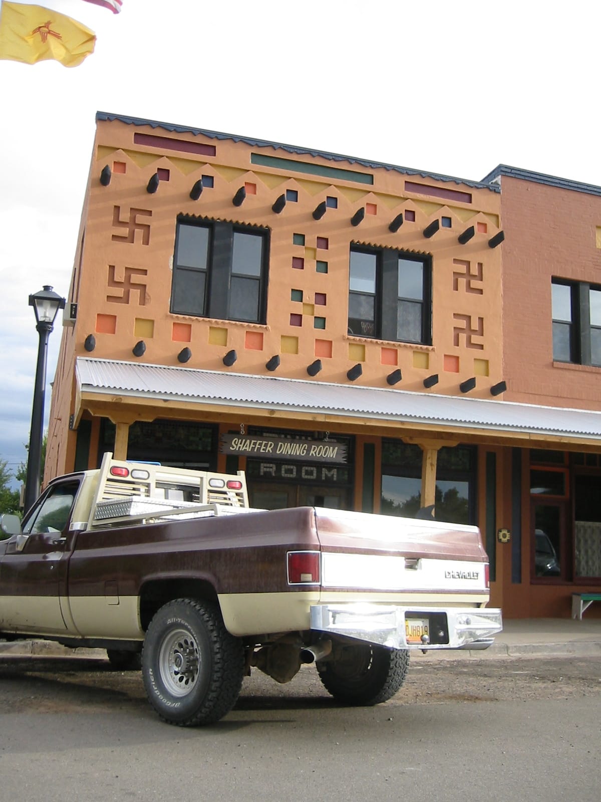 Just outside of Yaso, the rain began to pour, a real frog strangler to be sure. But the storm was short lived and soon the air was fragrant with the smell of dust, pinion and sage brush, one of the best smells in the entire world. Soon the mountains began to appear, the car started to slightly strain and the temperatures dropped. I had dinner in Mountainair at the Shaffer Hotel beautifully decorated in southwestern colors and covered with swastika. Darn that Hitler for stealing such a striking symbol. However, the irony of listening to “Take the Skinheads Bowling” by Camper van Beethoven while pulling up was enough to keep my chuckling for some time.