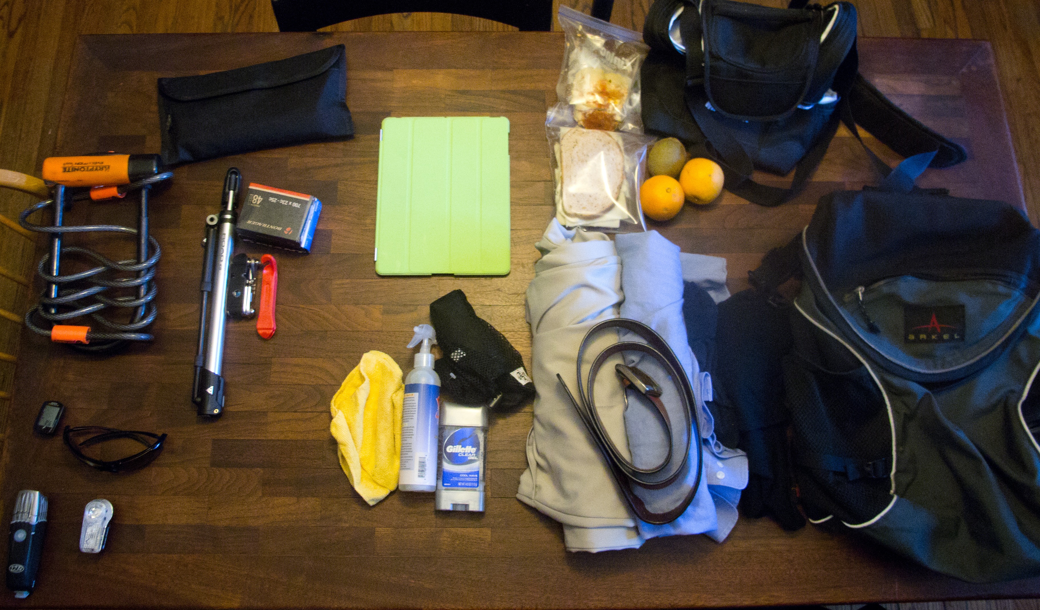 So far in my little experiment, I’ve really only been bicycling between home and work, which isn’t really a big change for me except that it’s my only option now. However, because I’m now completely reliant on the bicycle to get me around, I have been attempting to make myself absolutely prepared for as many problems as possible. I’m glad I did, since yesterday I had a nasty multiple puncture flat which thanks to equipment and planning was easily handled. In light of this and because for some reason I’m personally always fascinated by “what’s in my bag” posts, here are my commuting bag contents: